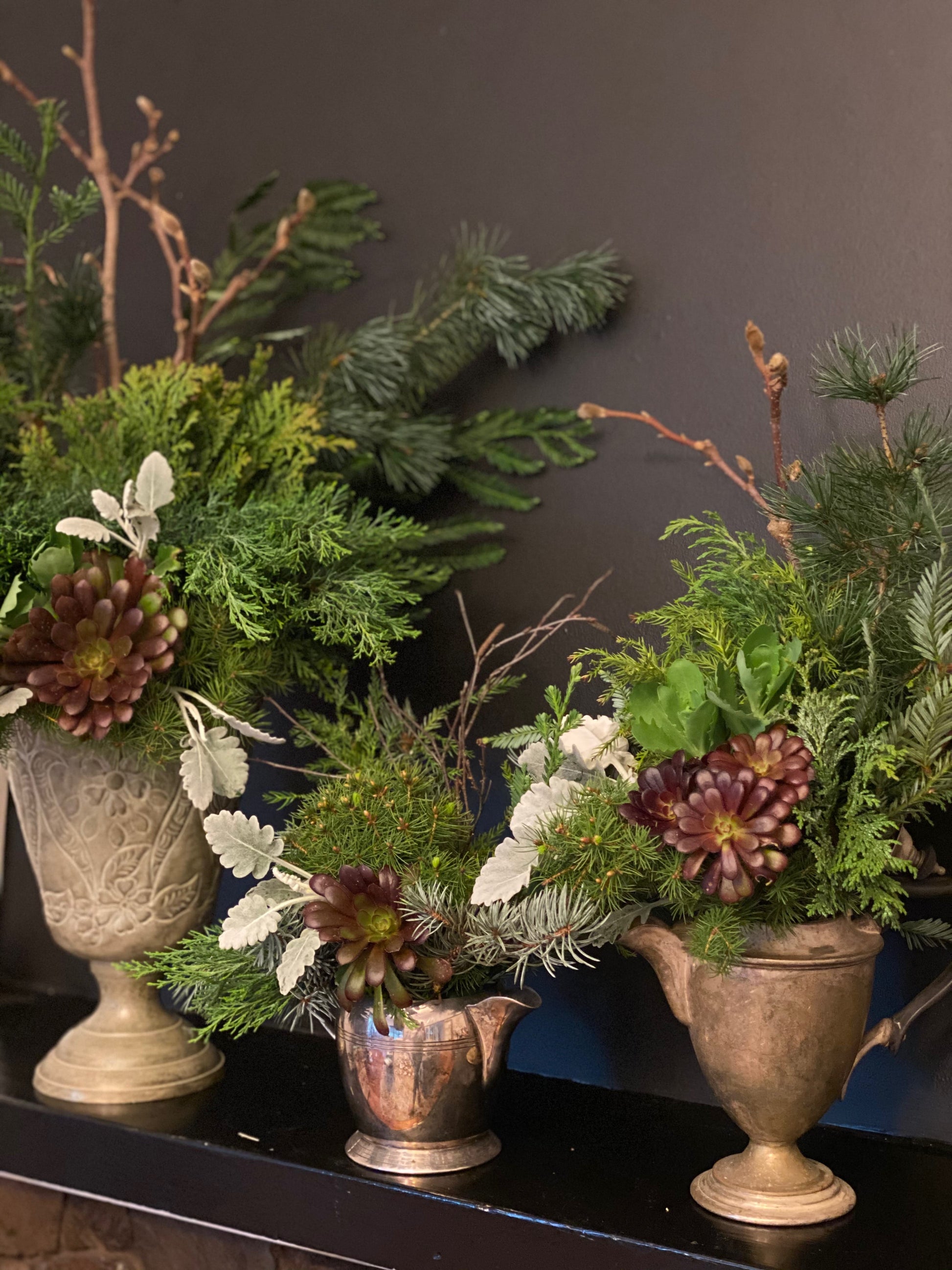 Our Christmas Centerpieces are handmade in a vintage vessel with fresh greenery and succulents. They are sure to add that finishing touch to your table.