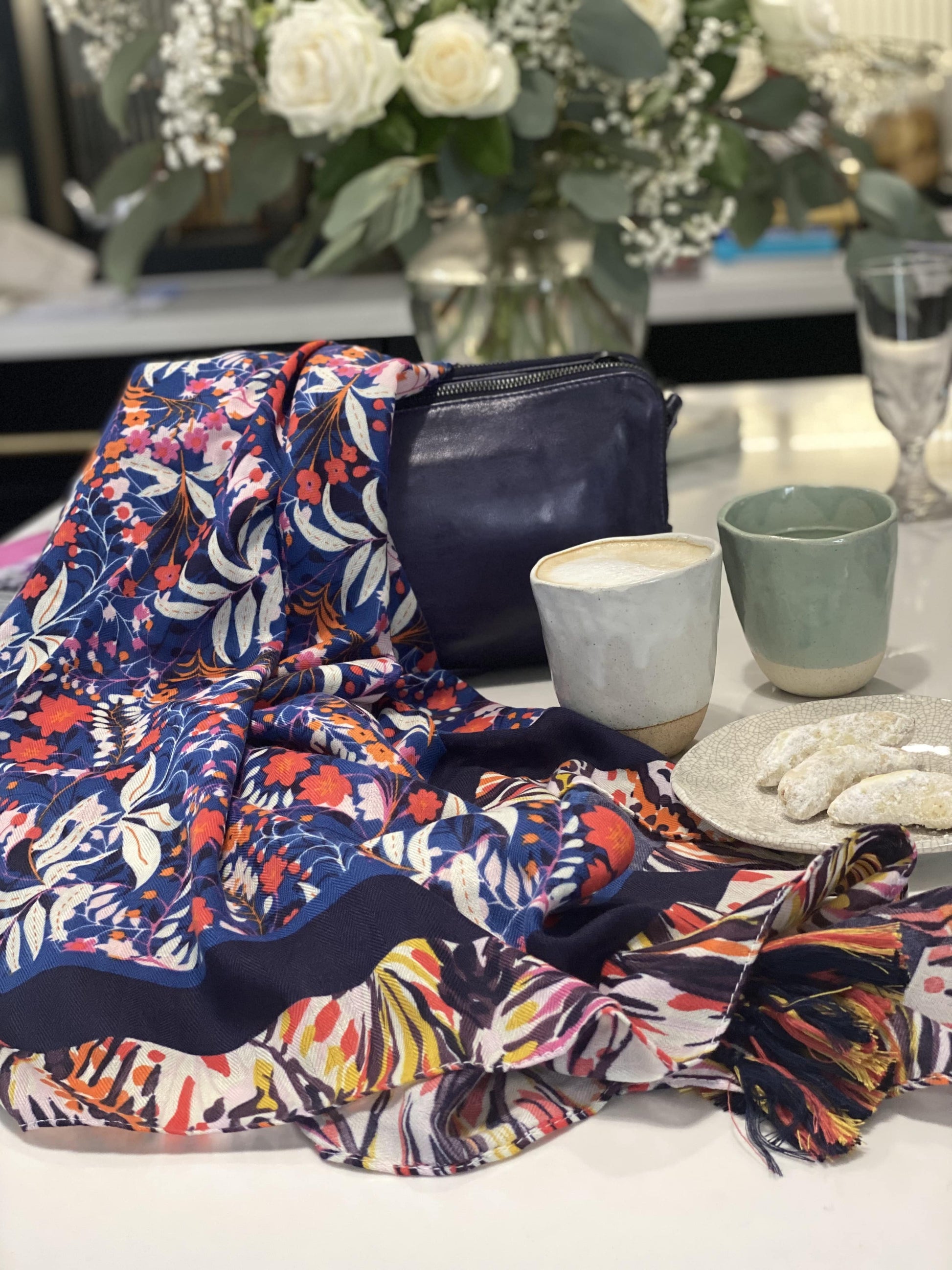 Our Lilly Scarf has a beautiful collection of floral patterns with a royal blue background. It is a larger square scarf the is finished with bright border and tassels on each corner.