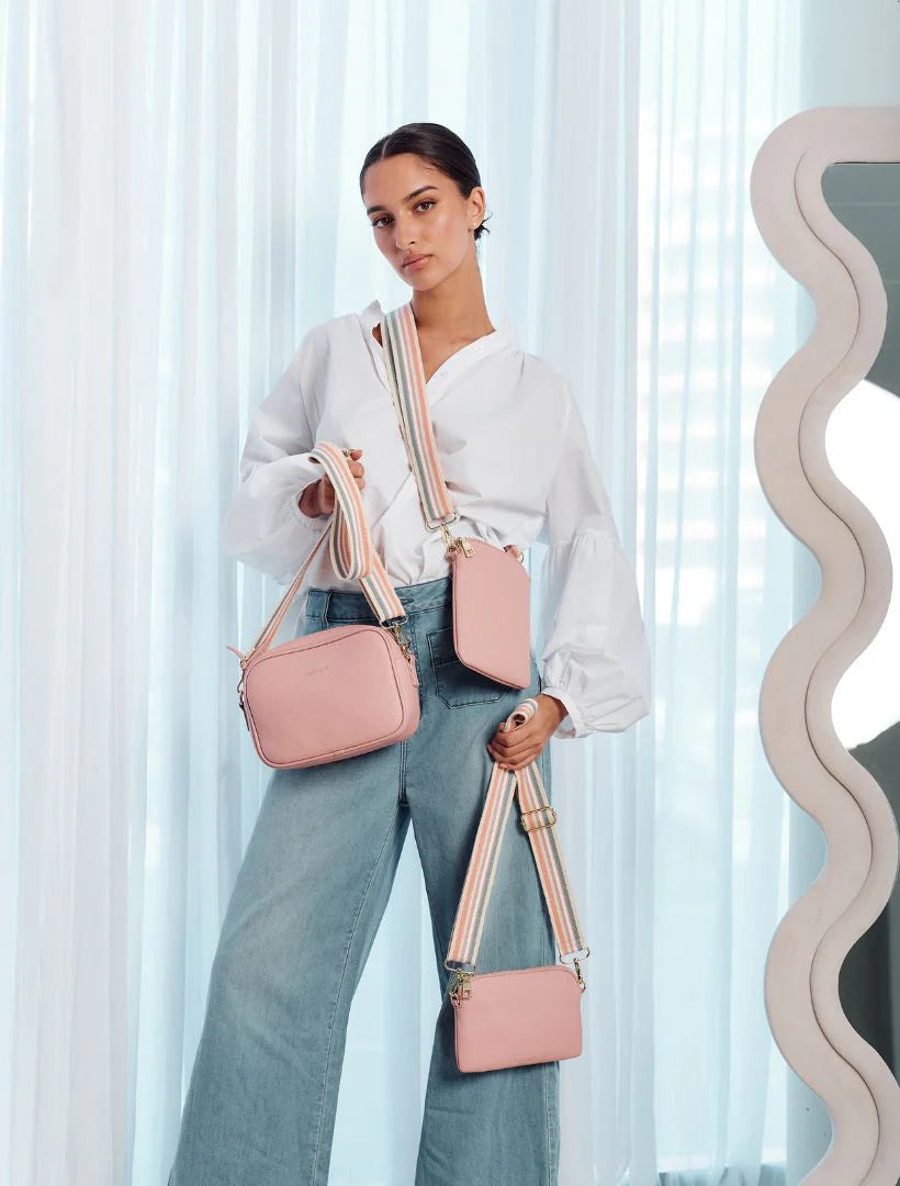 Our Wanderer Cross Body Bag is just the right size to carry a phone, lip gloss, cards and keys. With 4 internal card holders and an external zipper pocket on the back, she keeps all your easy to loose items safe. The fun webbing cross body strap gives it a super sporty vibe allowing you to be hands free at all time.